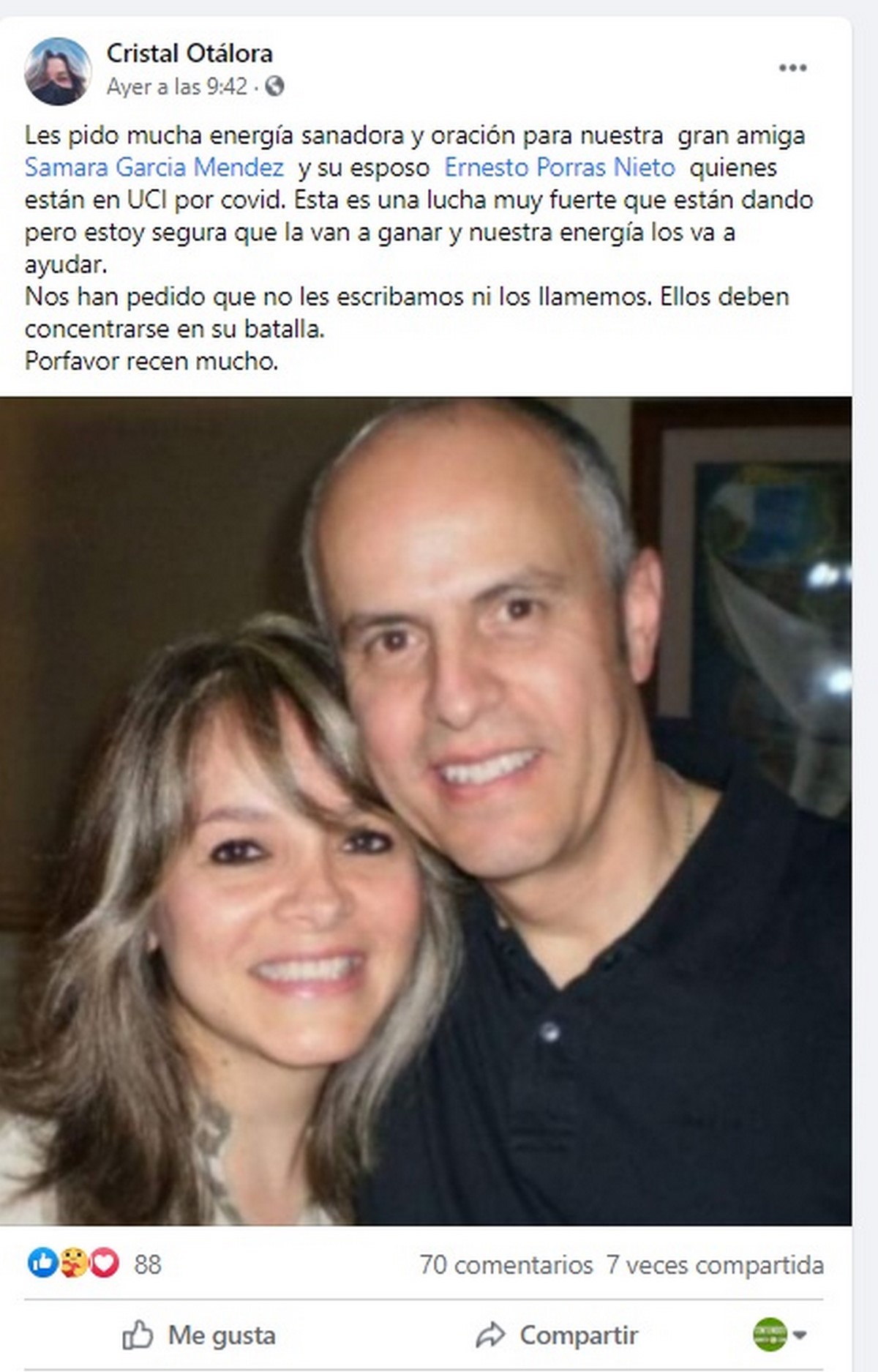 Una de las personas allegadas a Samara García Méndez expresó en su cuenta de Facebook, Les pido mucha energía sanadora y oración para nuestra gran amiga Samara García Méndez y su esposo Ernesto Porras Nieto quienes están en UCI por covid”.