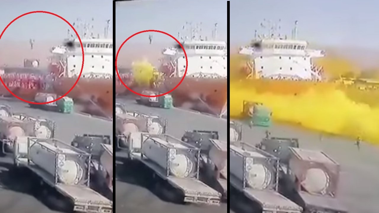 En video quedó el momento en el que ocurre el accidente en el puerto del Golfo de Aqaba. La emergencia se presentó luego de que cayera un contenedor con gas tóxico en un barco.
