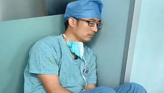 Yu había realizado 7 operaciones seguidas sin hacer ningún tipo de pausa, por lo que después de terminar, se sentó en el piso del centro médico y se quedó profundamente dormido.