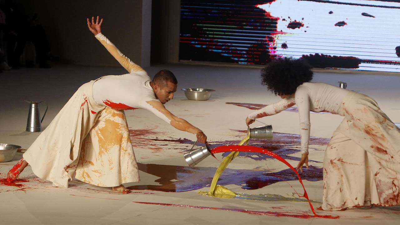 Dos personas realizan un performance durante la pasarela inaugural “Límites Indefinidos” de la diseñadora María Elena Villamil hoy, en Medellín (Colombia). EFE/ Luis Eduardo Noriega A.