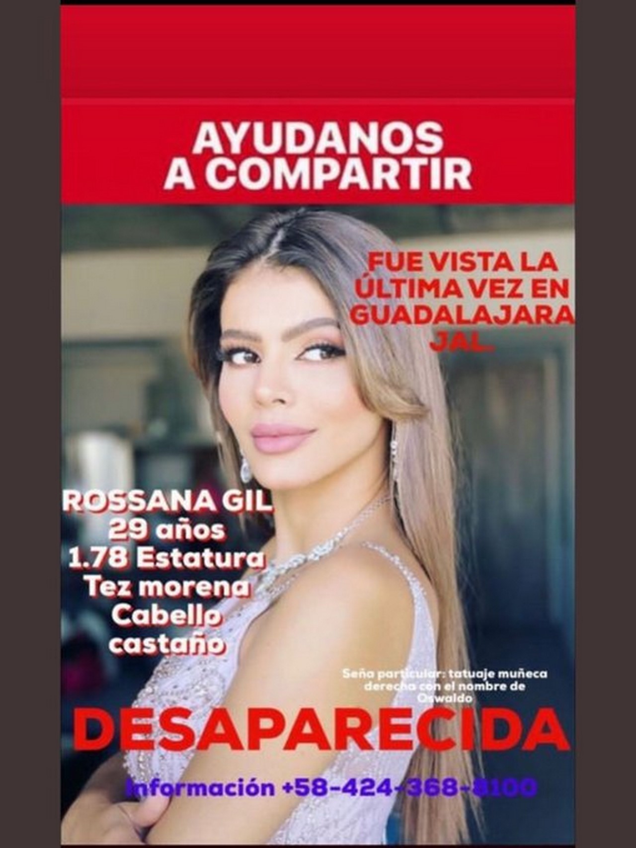 Por medio de redes sociales fue reportada como desaparecida la modelo venezolana Rossana Gil. La Fiscalía del estado de Jalisco en México abrió una investigación por la desaparición de la exmiss venezolana cuyo paradero es desconocido desde el pasado 19 de noviembre.