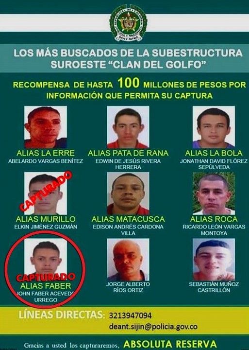 La Policía de Antioquia reportó la captura de un sujeto identificado con el alias de “Faber” quien actualmente figura en el cartel de los más buscados del suroeste antioqueño.