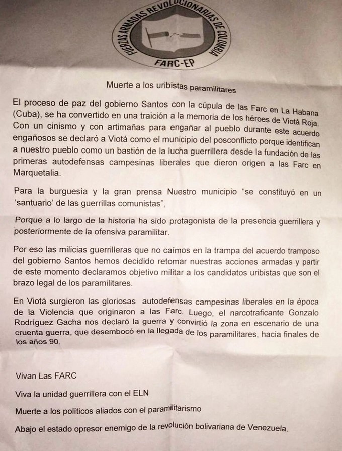“Por eso las milicias guerrilleras que no caímos en la trampa del acuerdo tramposo del gobierno de Santos hemos decidido retomar nuestras acciones armadas y a partir de este momento declaramos objetivo militar a los candidatos uribistas que son el brazo legal de los paramilitares”, dice un apartado del panfleto.
