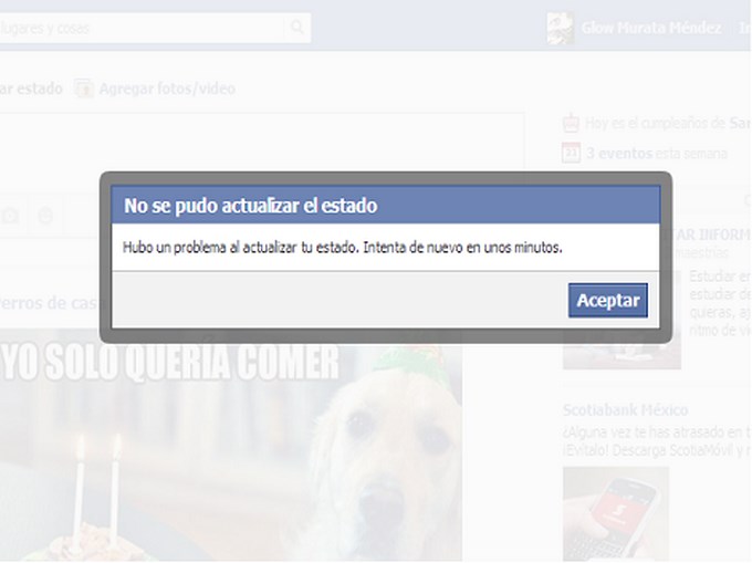 La imposibilidad de comentar y dar me gusta, así como las publicaciones personales al intentar postear un mensaje, la red arroja un mensaje de error.