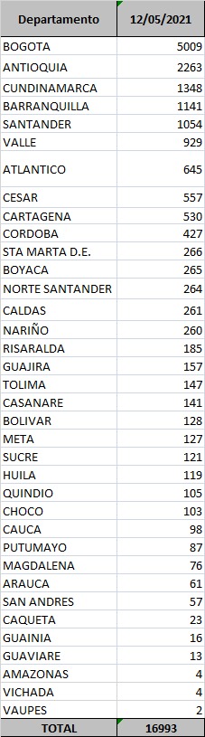 99.721 casos activoshttps://t.co/SiKTpTCQ3W pic.twitter.com/N67TWVnH5a— MinSaludCol (@MinSaludCol) May 12, 2021
