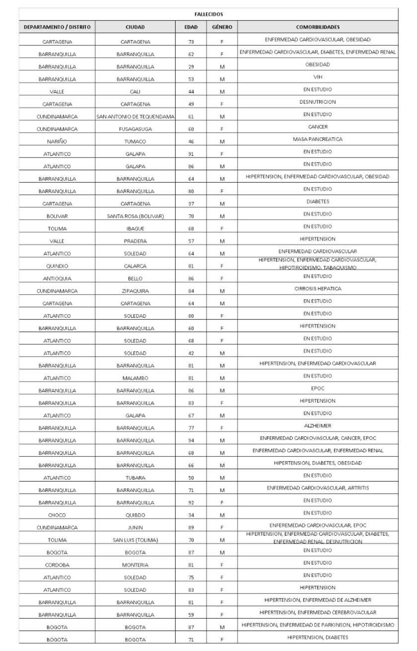 El Ministerio de Salud en su reporte diario de avance de la pandemia de coronavirus confirmó que en las últimas 24 horas 49 personas perdieron la batalla contra la COVID-19 en Colombia.