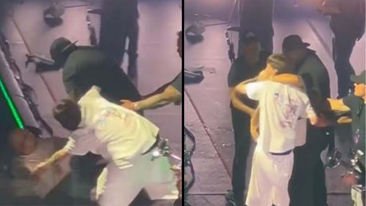 Sin embargo, en un segundo es teclado por un guardia de seguridad; fue brutalmente derrumbado y casi se caen del escenario.