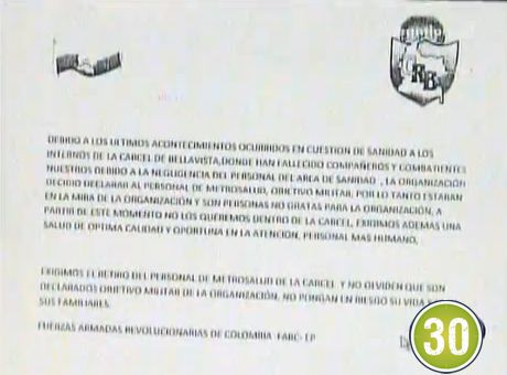 El panfleto hecho llegar a los médicos de Metrosalud, estaría firmado presuntamente por las farc, declarandolos como objetivo militar de la guerrilla narcoterrorista.