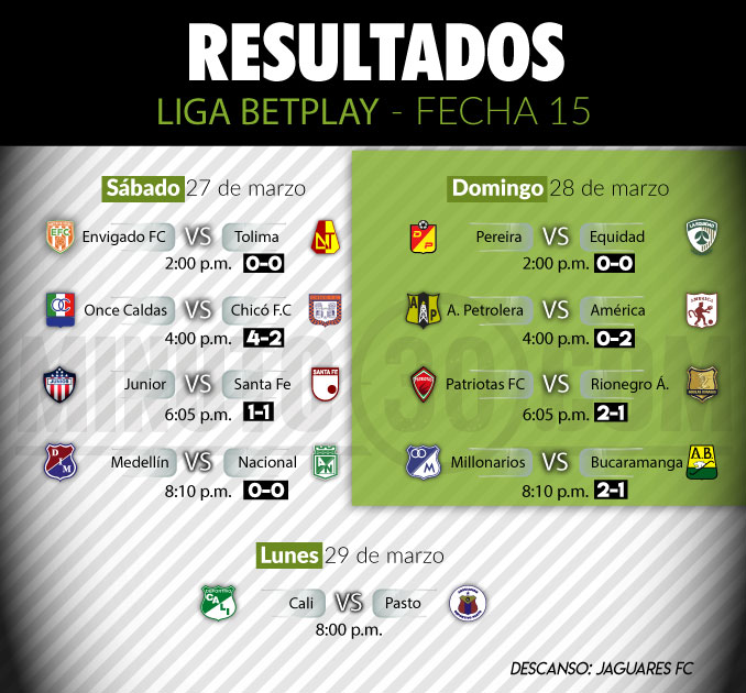 Minuto30.com- Los empates y la hegemonía de los locales predominaron en la fecha 15 de la Liga BetPlay I-2021, que se cumplió en su mayoría el fin de semana.
