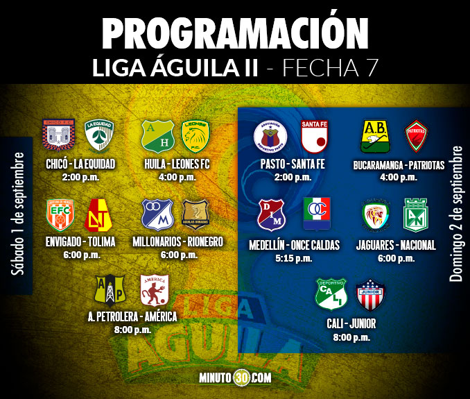 Minuto30.com- La Dimayor dio a conocer las fechas y los horarios para la fecha 7 de la Liga Águila II-2018, que se disputará entre el sábado 1° y el domingo 2 de septiembre.