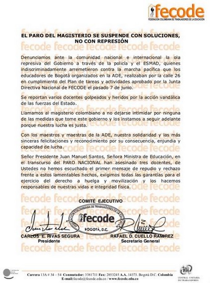 La Federación Nacional de Trabajadores -FECODE- hizo pública una denuncia, ante la comunidad nacional e internacional, por la represión que ha hecho el Gobierno Nacional durante las marchas que los educadores han realizado en el país, especialmente en Bogotá, durante el paro que este gremio adelanta y que está a punto de cumplir un mes.