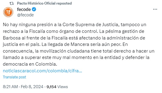 Así lo dio a conocer FECODE a través de un su cuenta de X, en donde escribió: “No hay ninguna presión a la Corte Suprema de Justicia, tampoco un rechazo a la Fiscalía como órgano de control. La pésima gestión de Barbosa al frente de la Fiscalía está afectando la administración de justicia en el país. La llegada de Mancera sería aún peor”.