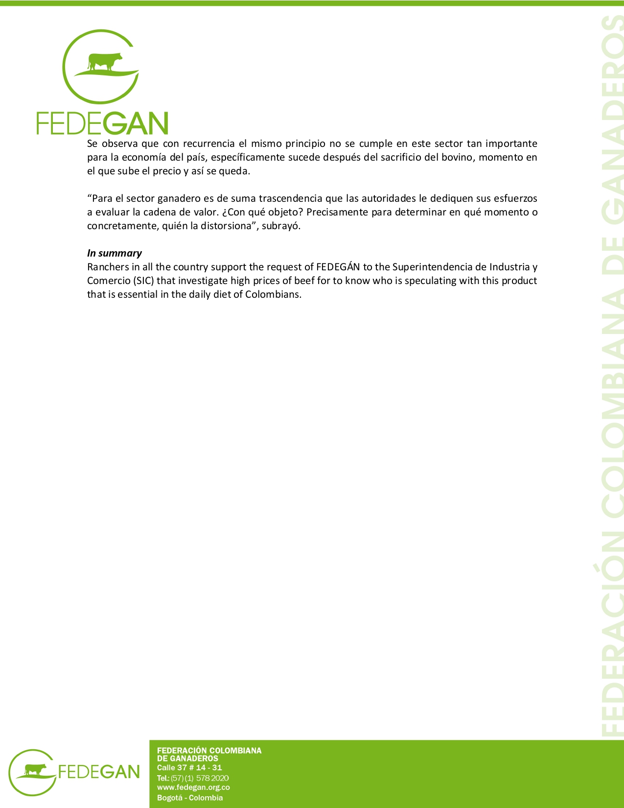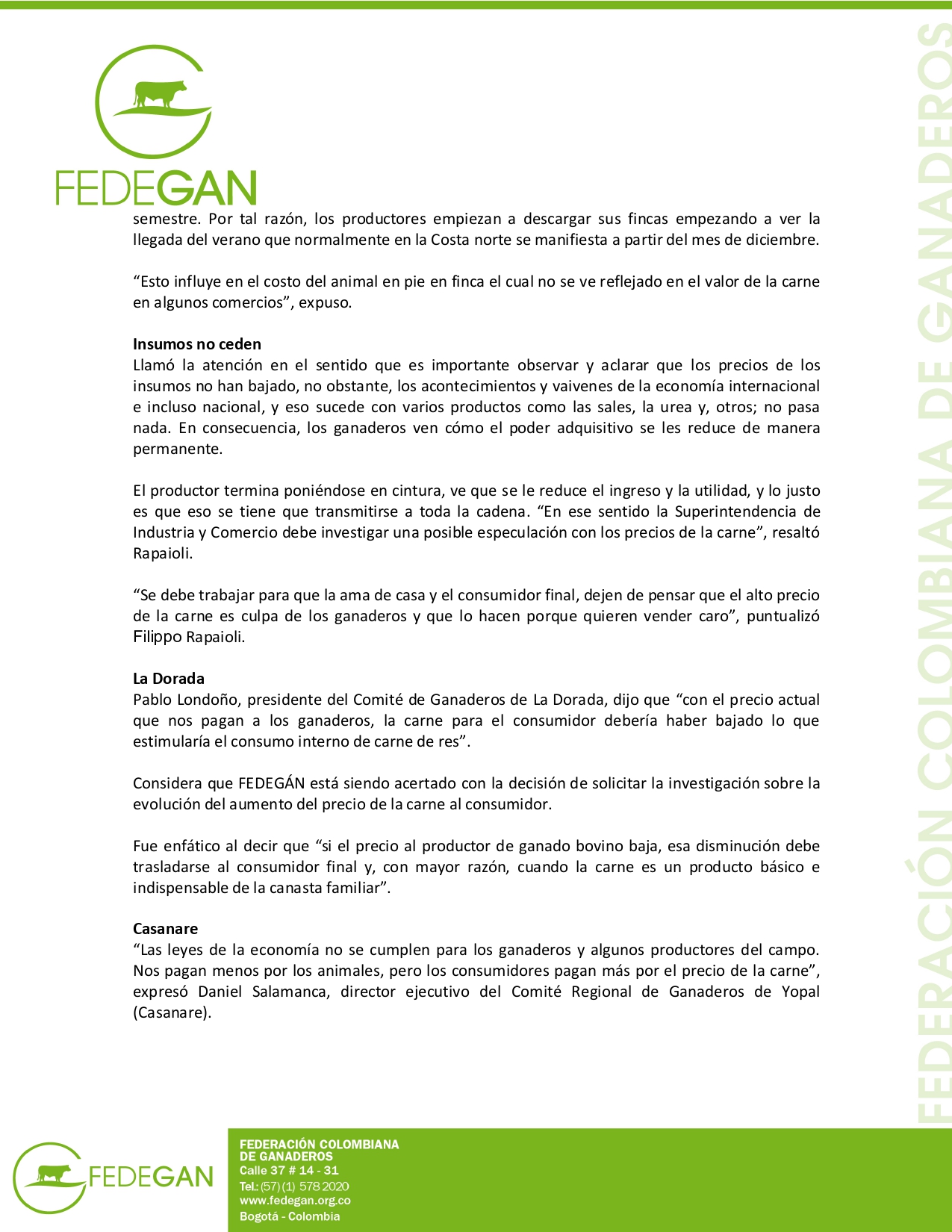 Agrega José Felix Lafaurie, presidente de Fedegan, a través de twitter que “para el sector ganadero es de suma trascendencia que las autoridades dediquen esfuerzos a evaluar la cadena de valor de la carne de res y determinar en qué momento o concretamente, quién la distorsiona”.