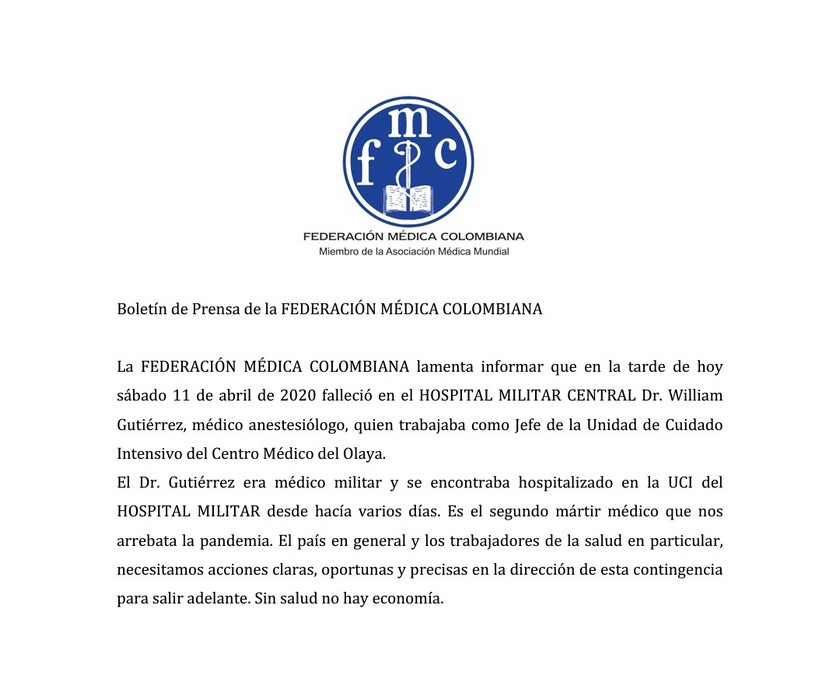 La Federación Médica Colombiana anunció la muerte de otro médico por Covid-19 en el territorio nacional, el deceso ocurrió en la tarde de este sábado 11 de abril en el Hospital Militar de Bogotá.