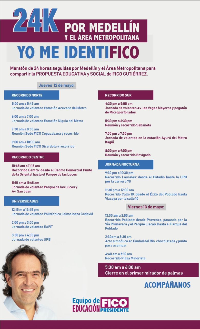 El candidato a la presidencia Federico Gutiérrez, inició desde la madrugada de este jueves, 12 de mayo, un recorrido por diferentes calles de Medellín, con el fin de socializarle a los paisas sus propuestas, específicamente en materia de educación.