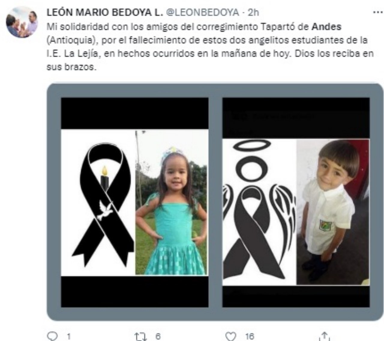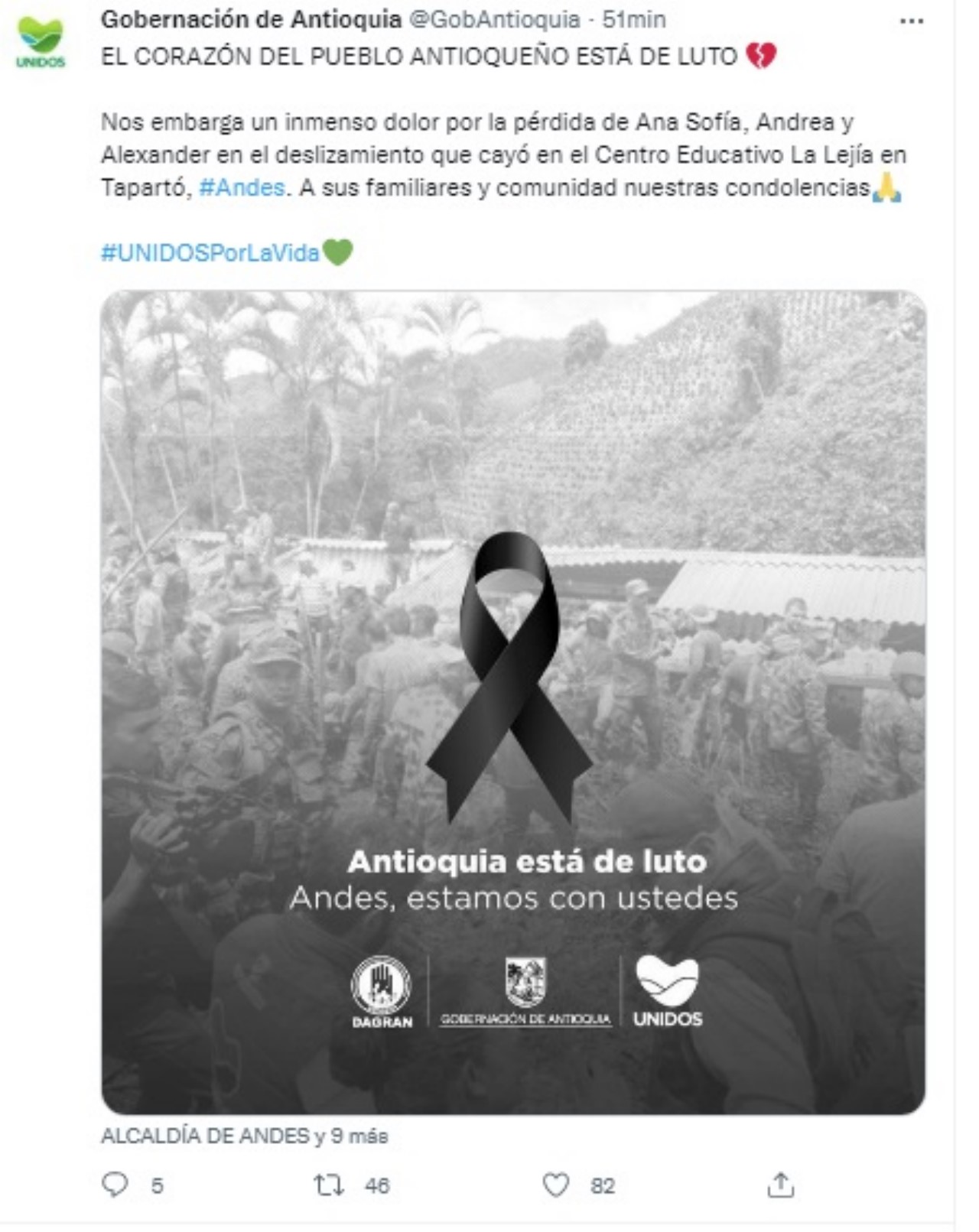 Por su parte, el alcalde de Andes, Carlos Alberto Osorio Calderón, al lamentar esta tragedia natural, confirmó que en el sitio al momento de la tragedia había 22 alumnos, la profesora y una madre de familia, dijo que “diecisiete de los niños fueron rescatados sin mayor novedad, los otros cinco, dos fueron llevados al hospital local y están fuera de peligro y estables. Pero damos una noticia muy triste, que tres niños pierden la vida en este hecho”.