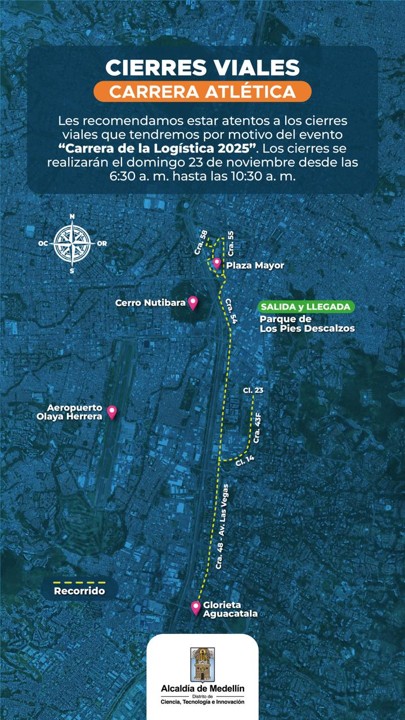 Por su parte, el domingo 23 de noviembre, se realizará la Carrera de la Logística 2025, con recorridos de 5, 10 y 15 kilómetros, cuyo punto de partida será el parque de Los Pies Descalzos. Las vías estarán cerradas desde las 6:30 a. m. hasta las 10:30 a. m., mientras que la competencia se desarrollará entre las 7:00 a. m. y las 10:00 a. m. Para esta actividad, la Secretaría de Movilidad desplegará un equipo de 24 agentes de tránsito para garantizar la seguridad de los participantes y la fluidez vehicular.