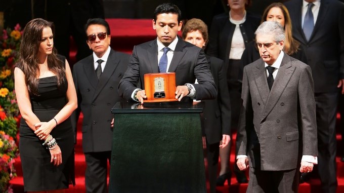 MEX63. CIUDAD DE MÉXICO (MÉXICO), 05/09/2016.- El hijo mayor de Juan Gabriel, Iván Aguilera (c), acompañado de su esposa, Simona Hakman (i), y el secretario mexicano de Cultura, Rafael Tovar y de Teresa (d), sostiene las cenizas de su padre hoy, lunes 5 de septiembre de 2016, durante homenaje de dos días en el Palacio de Bellas Artes de Ciudad de México (México). EFE/José Méndez