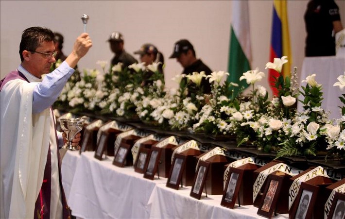 Un sacerdote bendice 38 urnas que contienen los restos de víctimas de las FARC y las autodefensas el 21 de junio de 2013, en Medellín (Colombia). EFE/Archivo