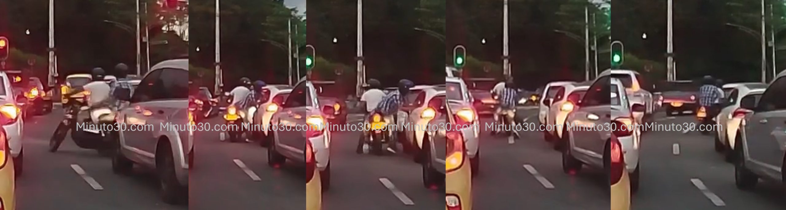 Tres individuos en dos motos habrían esperado el momento en que el semáforo se puso en rojo para “caerle” a un carro blanco que estaba en la fila de en medio.