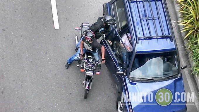 En una clara violación de la medida que prohibe el parrillero y en total impunidad, los fleteros obligan a un hombre a abrir la puerta; mientras el pasajero de la moto comete el ilícito el piloto hace las veces de ‘campanero’ mirando hacia atrás con actitud alerta.
