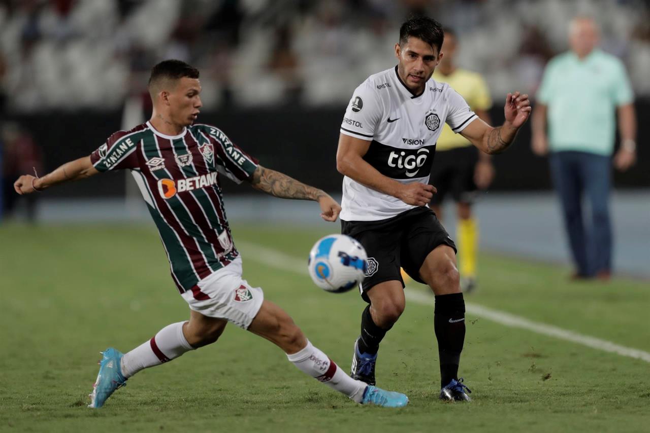 Calegari (i) de Fluminense disputa un balón con Ivan Torres de Olimpia hoy, en un partido de la Copa Libertadores entre Fluminense y Olimpia en el estadio Olímpico Nilton Santos en Río de Janeiro (Brasil). EFE/Antonio Lacerda POOL
