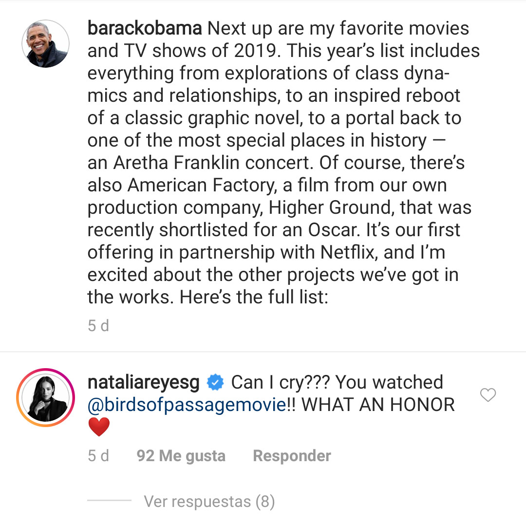 “¿Puedo llorar? Viste ‘Pájaros de verano’!!! Qué honor”, le comentó Natalia a Barack en su publicación, respuesta que ya cuenta con más de 90 likes y algunas respuestas.