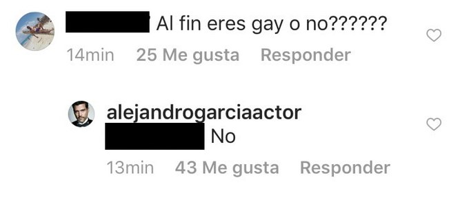 Un usuario le preguntó al actor Alejandro García a través de Instagram si era gay o no, a razón de un video en donde su exnovia, Eileen Moreno le dijo que era homosexual.