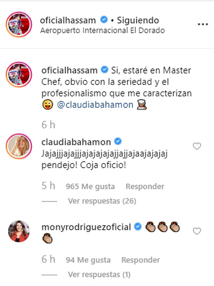 “Si, estaré en Master Chef, obvio con la seriedad y el profesionalismo que me caracterizan”, fueron las palabras de Hassam en el post, de inmediato la presentadora en medio de risas le respondió: “Jaja pendejo! ¡Coja oficio!”.
