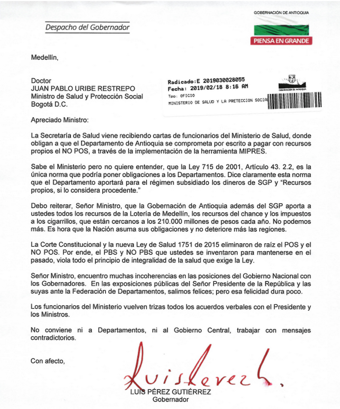 El gobernador de Antioquia, Luis Pérez Gutiérrez, le expresó por medio de una carta al ministro de Salud, Juan Pablo uribe, su inconformidad por algunos mensajes que ha recibido de ese despacho nacional, en el que le piden a la Gobernación asumir de cuenta propia el pago de los servicios No Pos y por eso, aseguró que ” es hora de la que Nación asuma sus obligaciones”.