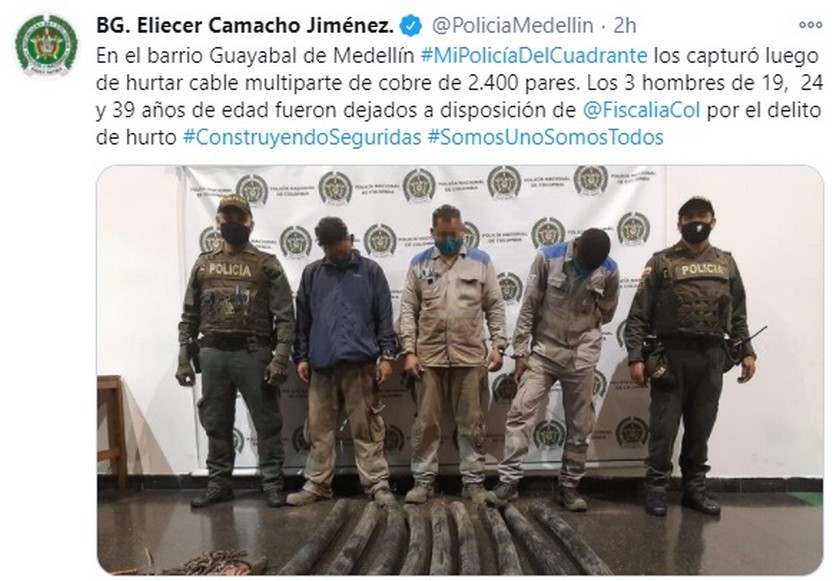 En el barrio Guayabal de Medellín #MiPolicíaDelCuadrante los capturó luego de hurtar cable multiparte de cobre de 2.400 pares. Los 3 hombres de 19, 24 y 39 años de edad fueron dejados a disposición de @FiscaliaCol por el delito de hurto #ConstruyendoSeguridas #SomosUnoSomosTodos pic.twitter.com/otvz0IUk5S