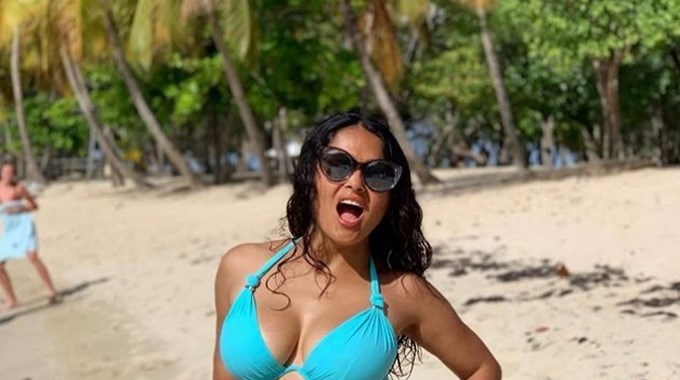 La actriz mexicana Salma Hayek se dejó ver en bikini de dos piezas color turquesa para celebrar por anticipado su cumpleaños. La postal fue publicada el domingo en horas de la tarde.