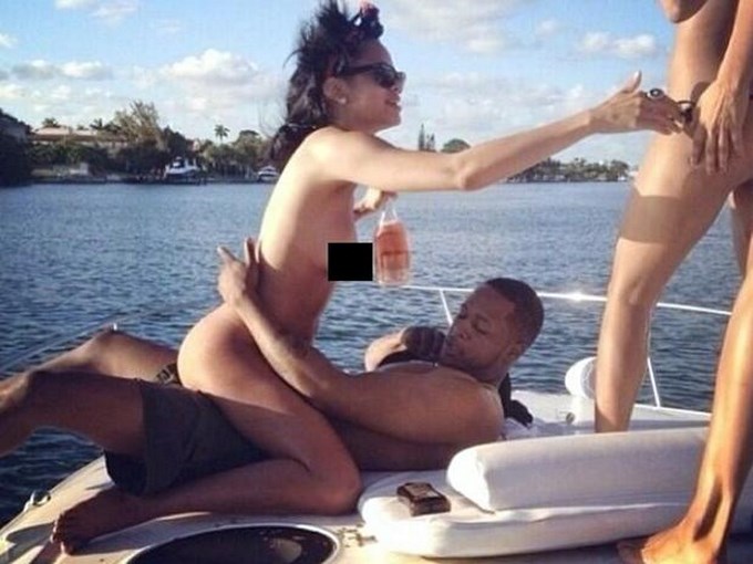 En la fotografía, supuestamente publicada en la cuenta de Instagram de Chris, la cantante barbadense aparece totalmente desnuda, sentada sobre la entrepierna del rapero, rodeada de otras mujeres semidesnudas y a bordo de un yate