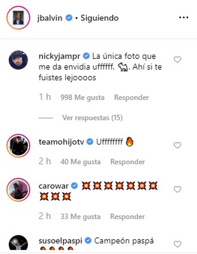 El paisa se ganó varios elogios, entre ellos, Nicky Jam le escribió: “La única foto que me da envidia uf. Ahí si te fuiste lejos”, Suso el Paspi también le comento: “Campeón paspá”, el cantante Luis Fonsi: “Uffff. Demasiado”.