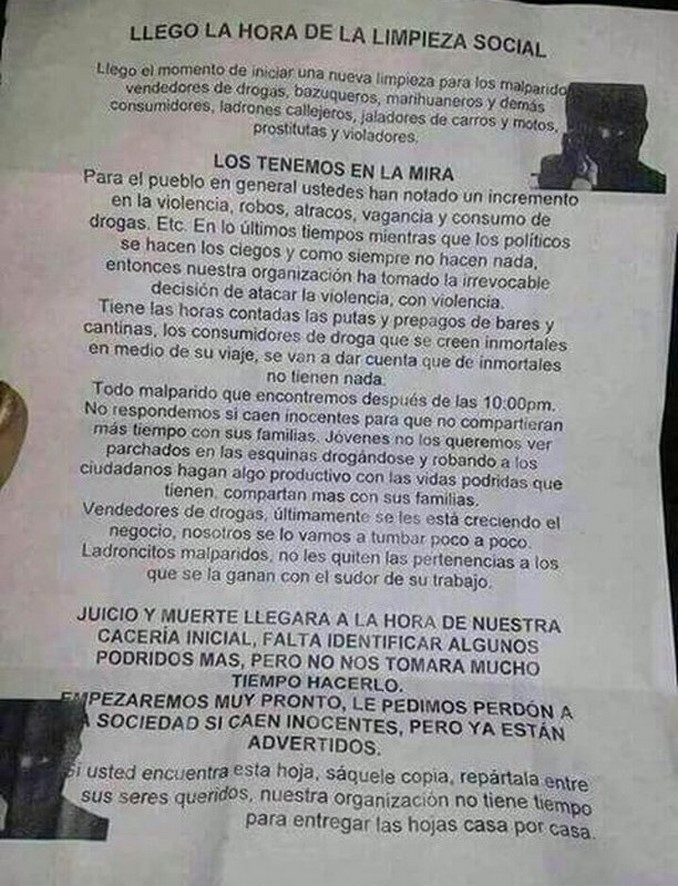 Una supuesta “organización de limpieza social” advirtió sobre una racha de violencia en dicha localidad, dado que “nuestra organización ha tomado la irrevocable decisión de atacar la violencia con violencia”, según se puede leer en el cartel.