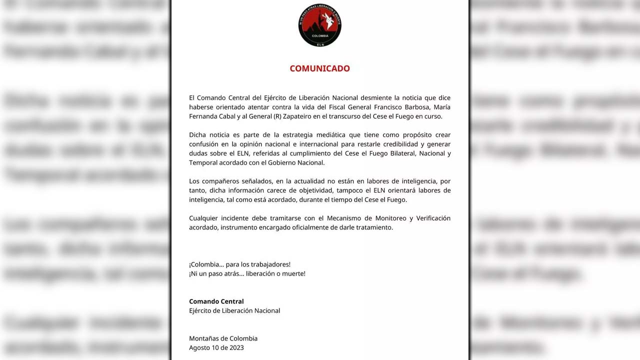 En el comunicado emitido por el ELN se lee que ‘Dicha noticia parte de la estrategia mediática que tiene como propósito crear confusión en la opinión nacional e internacional para restarle credibilidad y generar dudas sobre el ELN, referidas al cumplimiento del cese del fuego bilateral nacional y temporal acordado con el Gobierno Nacional’.