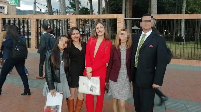 En la imagen se ve a Irlanda junto a su familia, vestidos para la ocasión, cerca a la Universidad Militar Nueva Granada, donde había acabado de recibir su título profesional del programa de relaciones internacionales y estudios políticos, además su tesis fue reconocida con una mención meritoria durante la ceremonia.