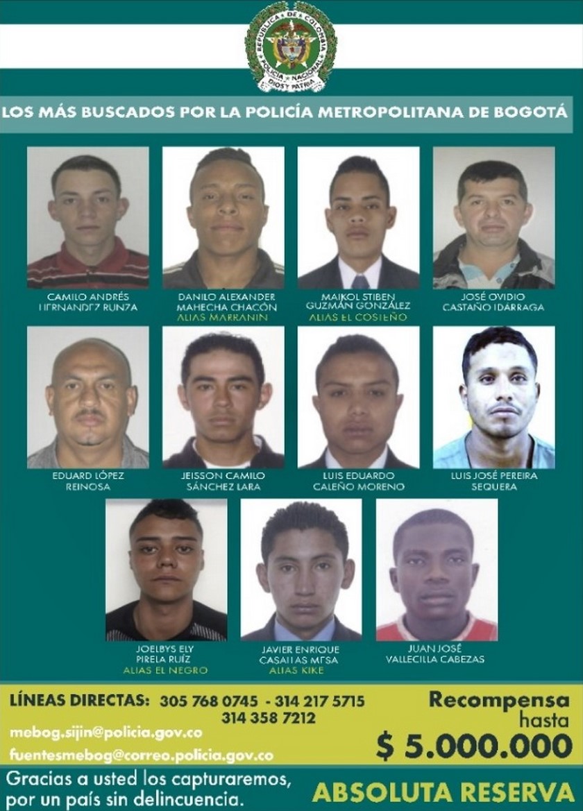 En la cuenta de Twitter de la Policía Metropolitana de Bogotá, mostraron los nombres y rostros de los presuntos ladrones más buscados y las personas señaladas de homicidios para que la ciudadanía ayude a dar con el paradero de los más buscados.