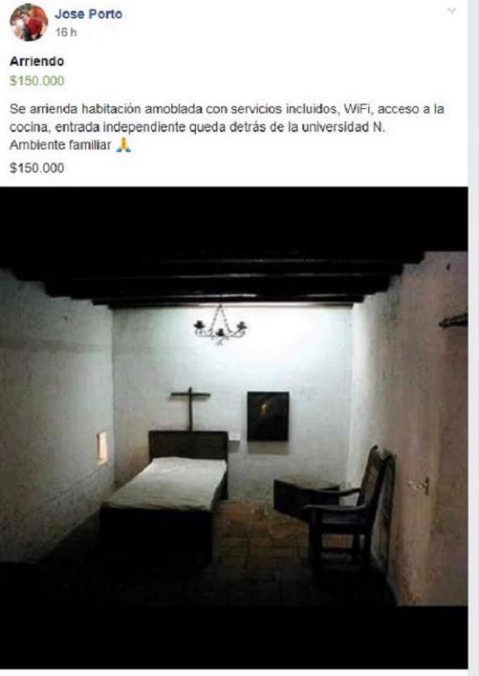“Se arrienda habitación amoblada con servicios incluidos, WiFi, acceso a la cocina, entrada independiente queda detrás de la universidad N. Ambiente familiar. $150.000”, es lo que revela la publicación.