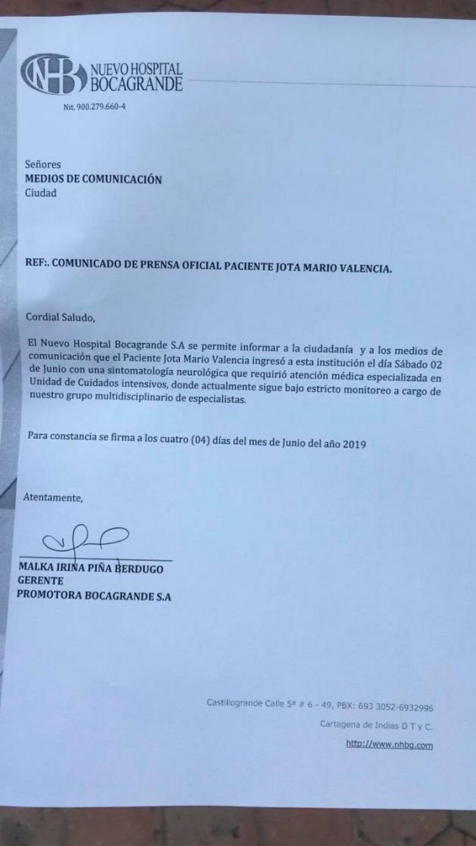 Luego de que el presentador Jota Mario Valencia tuviera que ser internado de urgencia en el hospital Bocagrande, de Cartagena, por un quebranto en su salud, comenzó a rondar en redes sociales muchas hipótesis de lo que le habría pasado. Tras esos rumores, el centro clínico informó a la opinión pública el primer parte médico oficial y explicó lo que le sucedió.