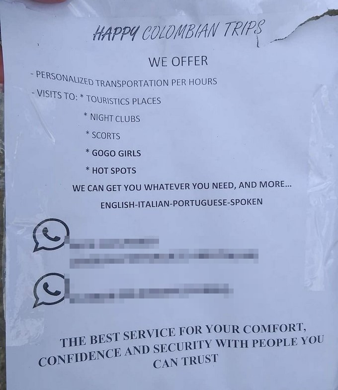 Los habitantes del barrio Manila, El Poblado, amanecieron llenos de volantes que ofrecen a los visitantes extranjeros paquetes y visitas a “lugares calientes”, de acuerdo con la información de un seguidor de Minuto30.