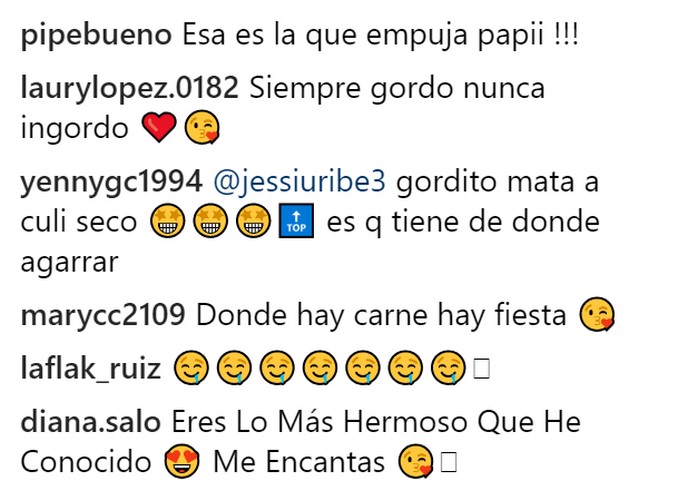 En la imagen Jessi aparece sin camisa y con el pantalón desabrochado, “si, gordito y qué?, así me quieren” escribió el cantante, a lo que Pipe Bueno respondió chistosamente “esa es la que empuja papi!”, haciendo referencia a su abdomen.