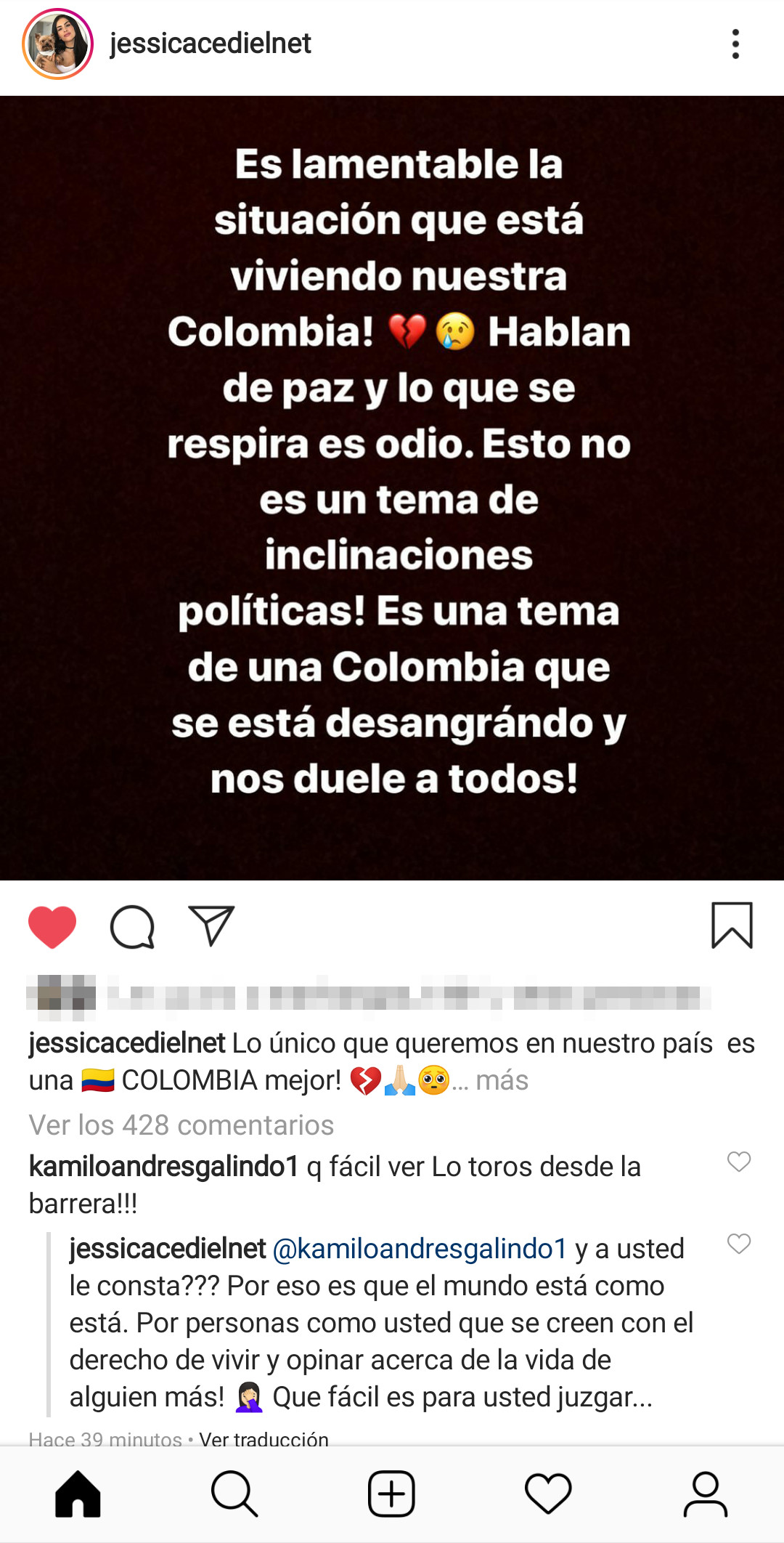 Jéssica hizo una publicación en su cuenta oficial de Instagram afirmando que lamenta la situación que está viviendo Colombia. “Hablan de paz y lo que se respira es odio. Esto no es un tema de inclinaciones políticas, es un tema de una Colombia que se está desangrando y nos duele a todos”, dice el post, que uno de sus seguidores criticó.