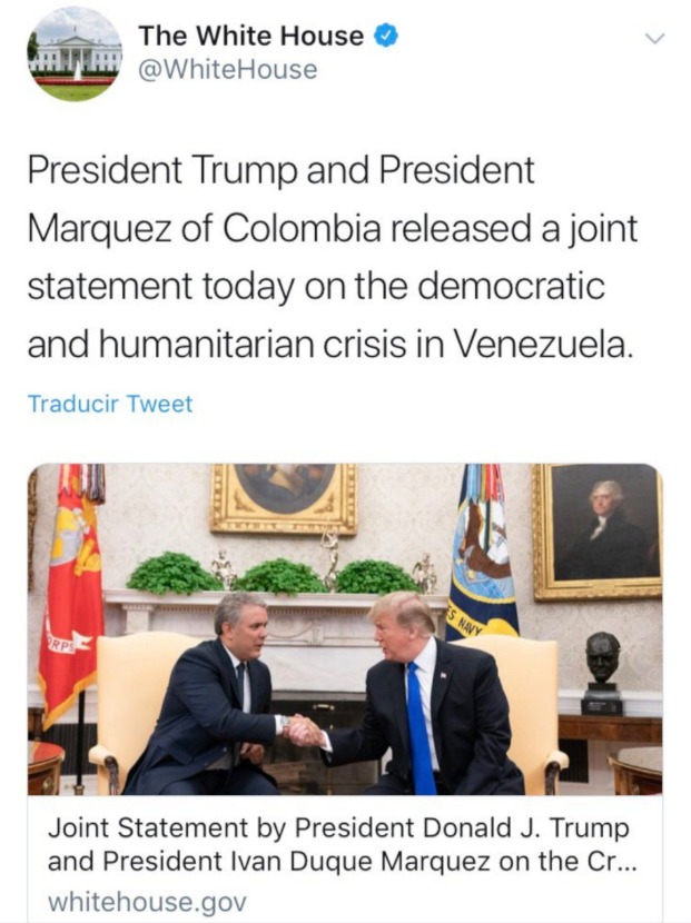 “President Trump and President Márquez of Colombia released a joint statement today on the democratic and humanitarian crisis in Venezuela”, escribieron en el tweet, refiriéndose al Presidente Duque de manera incorrecta como el “Presidente Márquez”.