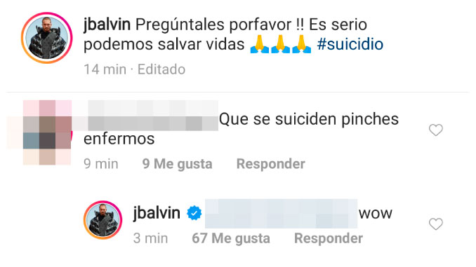 FOTO: La mala respuesta de este usuario a video sobre suicidio que asombró hasta al mismo J Balvin