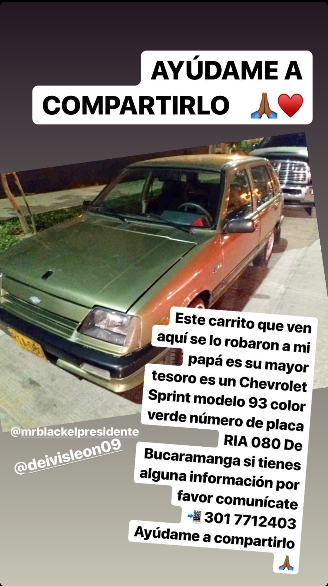 “Este carrito que ven aquí se lo robaron a mi papá es su mayor tesoro es un Chevrolet Sprint modelo 93 color verde número de placa RIA 080 De Bucaramanga si tienes alguna información por favor comunícate al 301 7712403 Ayúdame a compartirlo. El valor sentimental es distinto al valor comercial”, escribió en una de sus historias la intérprete de “Sailor Moon Rémix“.