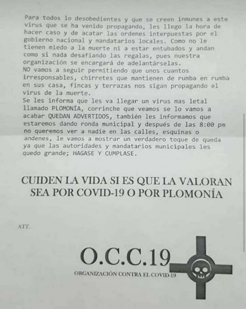 Hace un par de días atrás se conocieron las denuncias ciudadanas sobre un volante en el que amenazaban de muerte a la comunidad que estaba incumpliendo las medidas de bioseguridad decretadas por el Gobierno Nacional.