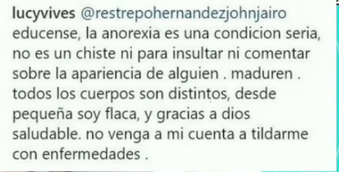 Lucy, la hija de Carlos Vives se cansó de quienes la critican por ser delgada y hasta la tildan de sufrir anorexia. Sin más, la joven decidió responderle a uno de los detractores: “La anorexia es una condición seria y no es un chiste para insultar ni comentar sobre la apariencia de alguien”, destacó y […]