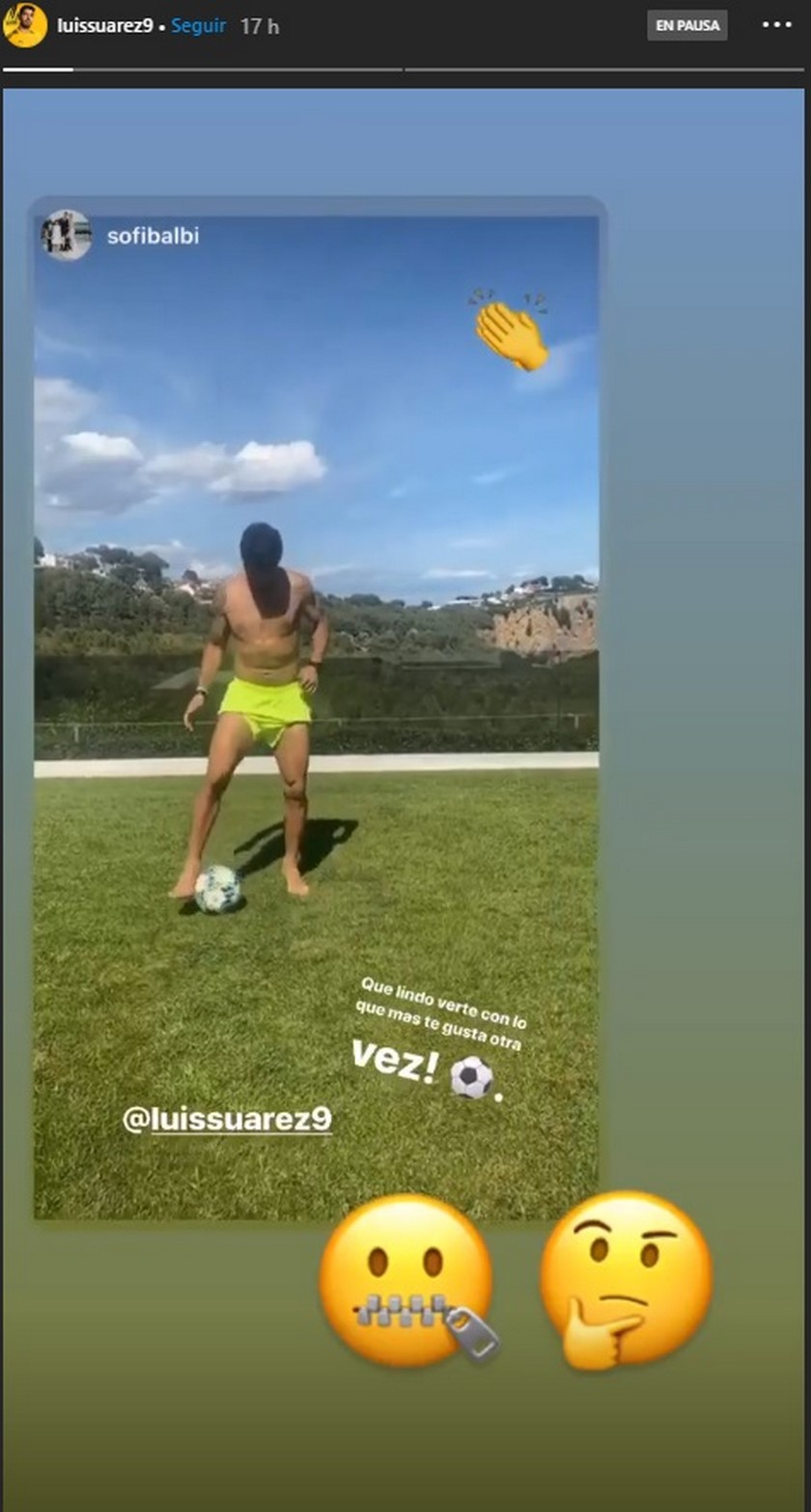 A través de sus estados de Instagram, la esposa de Suárez, Sofía Balbi, publicó un video en el que salía el futbolista sin camiseta, en pantaloneta, descalzo y haciendo algunos toques con la pelota.