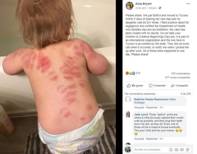 Alice Bryant, una madre de Arizona, Estados Unidos, denunció a través de sus redes sociales un terrible caso que le ocurrió a su pequeña hija Rosalyn, de un año y tres meses, quien fue mordida más de 25 veces en un guardería.